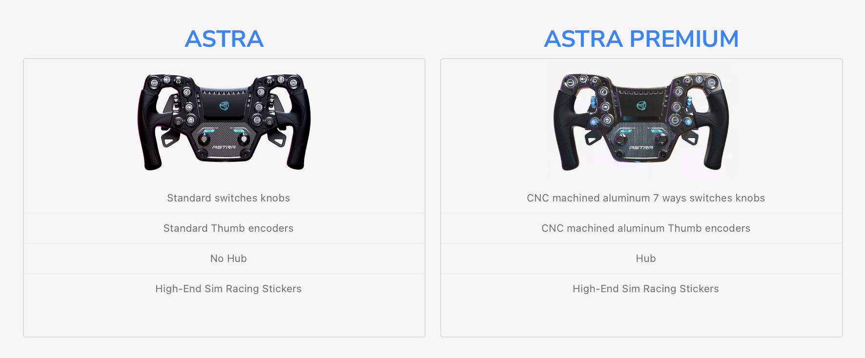 Astra is the most customizable Cube Controls wheel yet, with new RGB buttons, telemetry lights and the RGB Cube Controls logo being fully Sim-Hub compatible, giving you all the informations you need to race at the highest level while being unique.